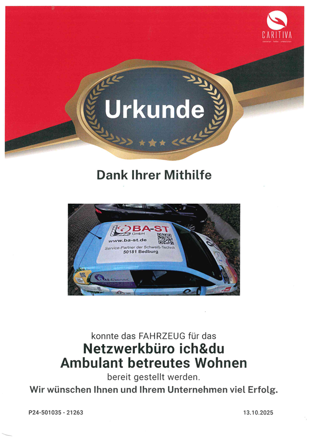 Das benötigte Fahrzeug wurde am 13.10.25 an das „Netzwerkbüro ich&du Ambulant betreutes Wohnen“ durch die „Caritiva GmbH“ übergeben und kann nun den Alltag erleichtern.